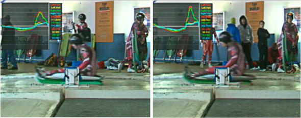 Simultaneous video and force data were collected on nine Luge athletes (total of 45 trials) at the indoor training facility at Canada Olympic Park (Calgary, CANADA). Video data were collected using a digital video camera at 30Hz. Four channels of force data were collected from the right and left pull handles instrumented with force sensors at 1200 Hz (Kistler). Data from the force sensors were stored as individual trails in text files for future processing. Real-time video and force graphs were collected as individual video images for each pull trial. Figure 2 below illustrates a frame of video of two separate athletes with the force graph over top of the video in the top left corner.
