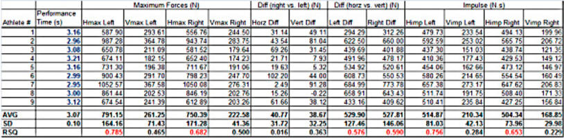 Table 1: Data summary of force variables from nine Luge athletes during the pull start. Performance times are listed on the left in blue text. Correlations (RSQ) are listed in the bottom row with high correlations in red highlights.