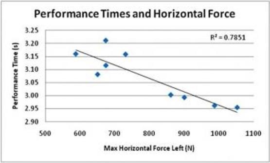 It is clear from the graph that the performance improves (time lower) as you increase the horizontal force. From Table 1, it is shown generally that increase in horizontal forces (left or right), larger differences between the horizontal and vertical force signals and higher impulses in the horizontal signals all lead to better performances (lower times).