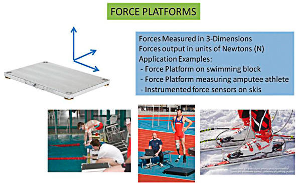 Video provides information related to the movement of the athletes. However, video does not provide information on the forces exerted on or by the athlete. Technologies such as force sensors, pressure sensors and muscular measurement devices can provide insights into the forces that are produced and act on the athlete. Figure 3 below illustrates some examples of how force sensors can be used to measure forces that the athlete is producing during movements.