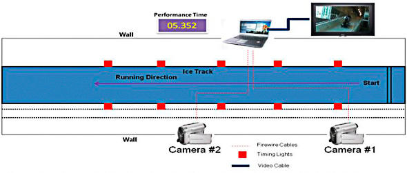The implementation of a technology into sport for use in assessment and improvement of performance is not as trivial as one might think. Many technologies exist; however, technology must provide simple and quick information. If it is too complex and cumbersome to use, there will be immediate failure within the execution and can impact success in the overall program. An example of implementation of technologies might be the setting up of a video and timing system that will collect simultaneous video and performance time information at an indoor training venue. Figure 5 below presents the layout of such a system.