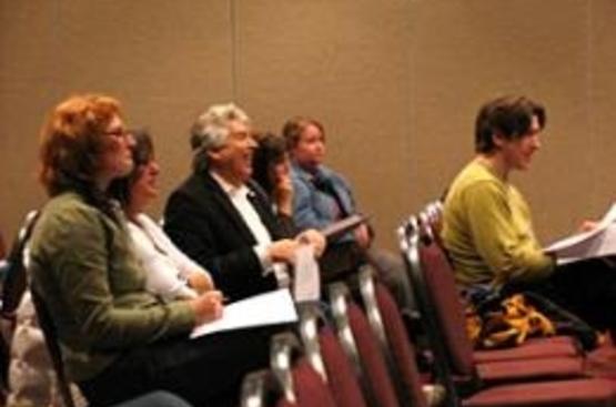 Roch Carrier and French teachers enjoying Dr. Bougaïeff's presentation of Le chandail de hockey (Saskatoon, October 2006)